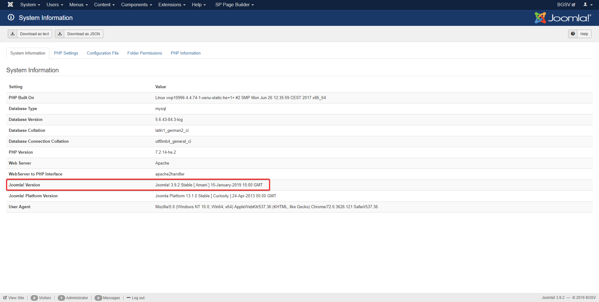 2. Sie finden die von Ihnen aktuell verwendete Version auch auf der Registerkarte Systeminformationen unter System > Systeminformationen in der Zeile Joomla! Version.