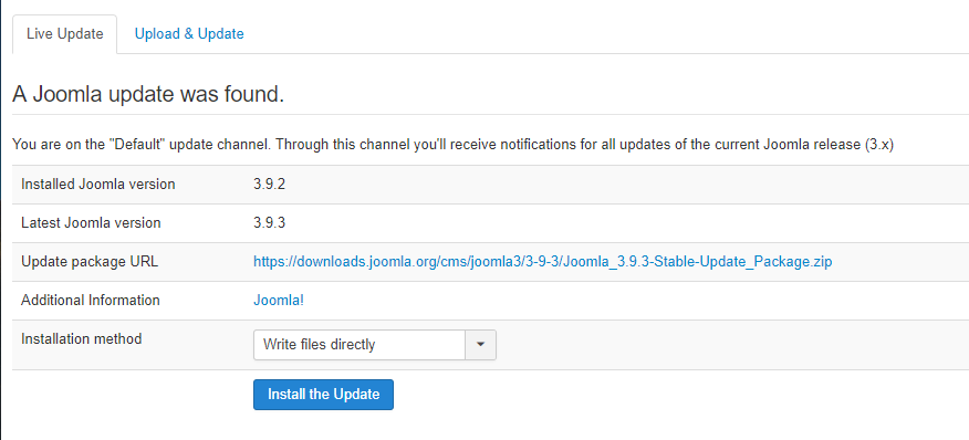 2. Wenn Sie das Joomla Update Toolöffnen, werden Sie sofort informiert, wenn eine neuere Version verfügbar ist. Im Abschnitt Komponenten > Joomla! Update ehen Sie so etwas wie: