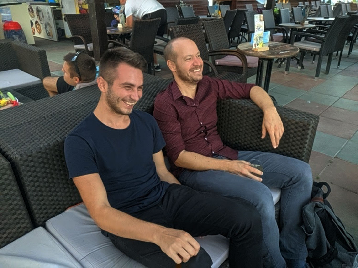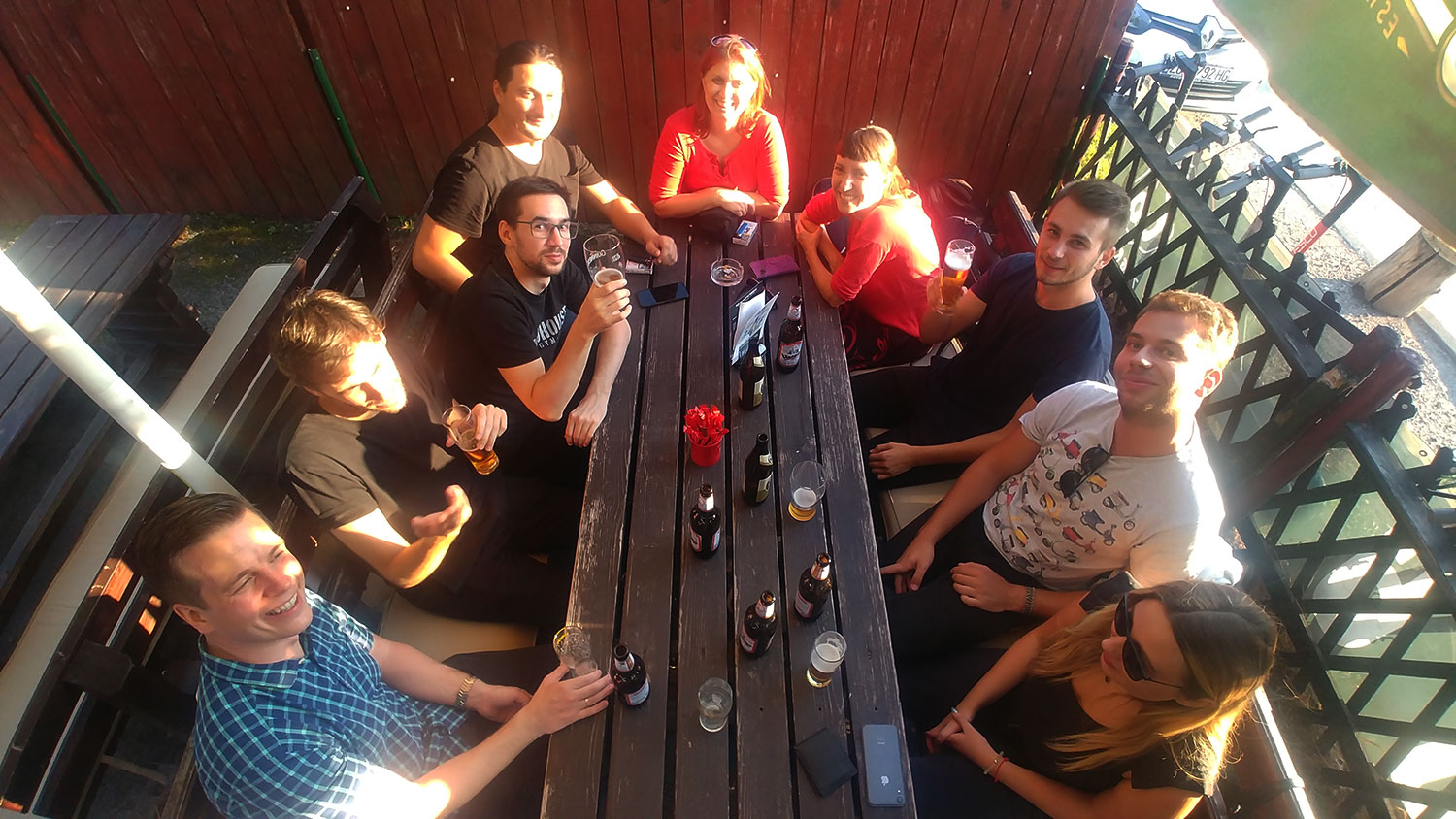 Die beiden Hälften des Teams trafen sich in einer Bar mit einer fantastischen Biergartenterrasse und genossen das Bier und die Sonne.