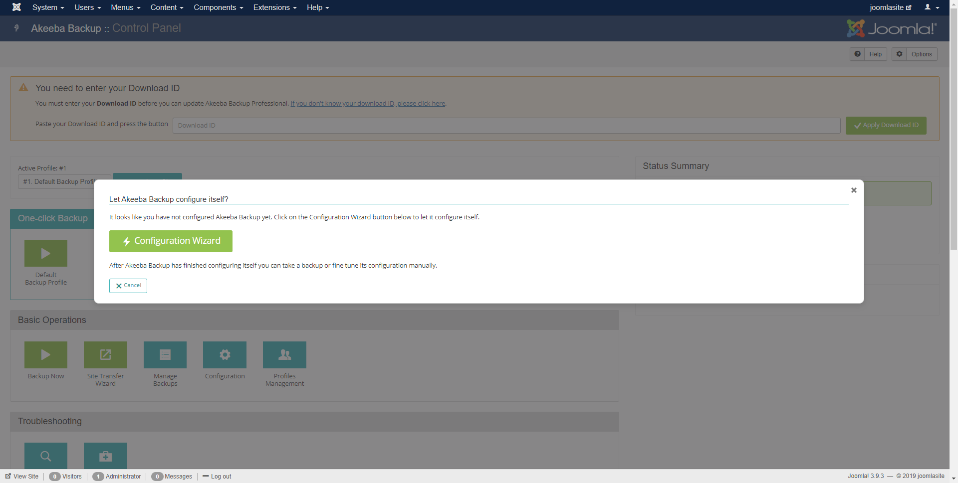 Erster Start von Akeeba Backup - Klicken die auf den Konfigurations Wizard und lassen Sie ihn sein Ding machen...