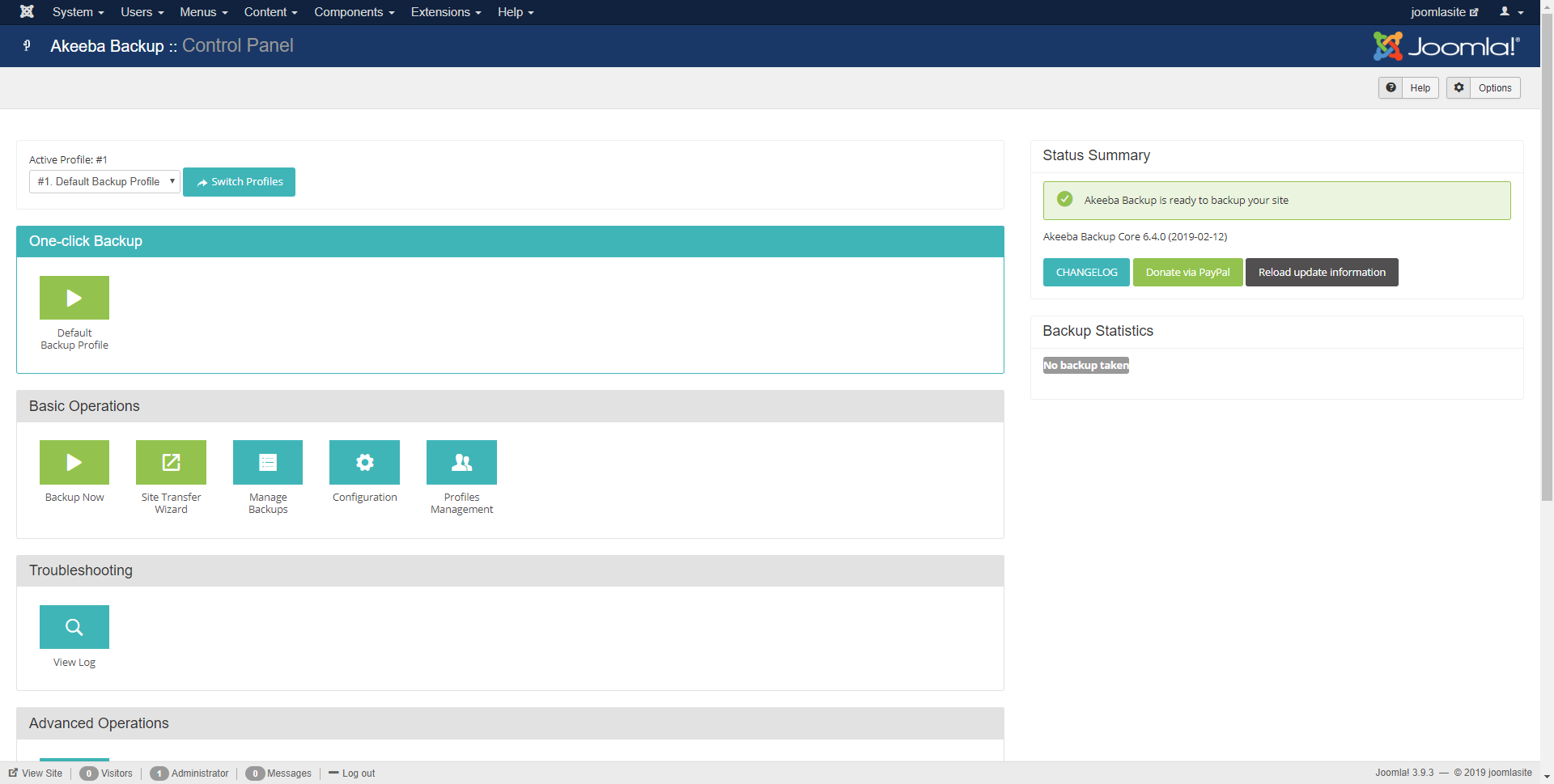 - Sobald das erledigt ist, wird Ihnen Akeeba-Hauptmenü angezeigt.