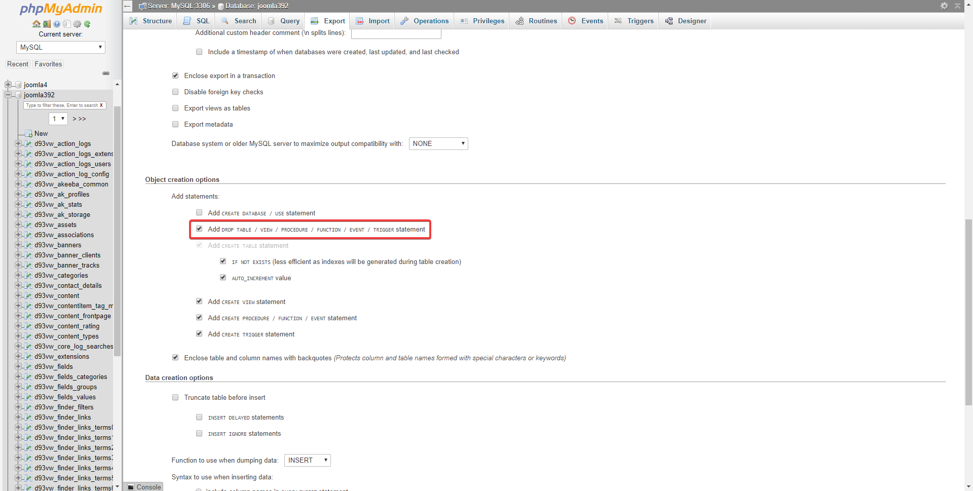 Exportieren Ihrer Datenbank - Scrollen Sie nach unten und wählen Sie innerhalb der Objekterstellungs-Optionen die Option Add DROP TABLE / VIEW / PROCEDURE / FUNCTION / EVENT / TRIGGER statement