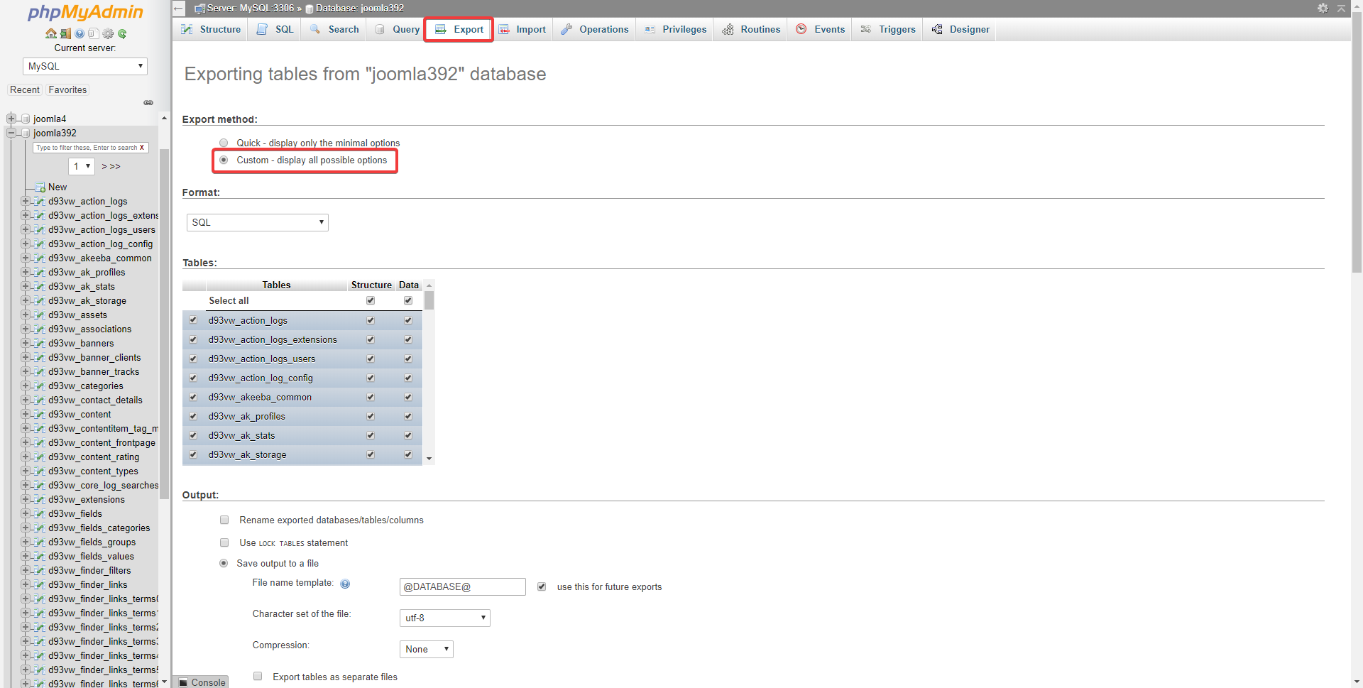 - Öffnen Sie phpMyAdmin, wählen Sie Ihre Joomla-Datenbank aus und exportieren Sie sie.