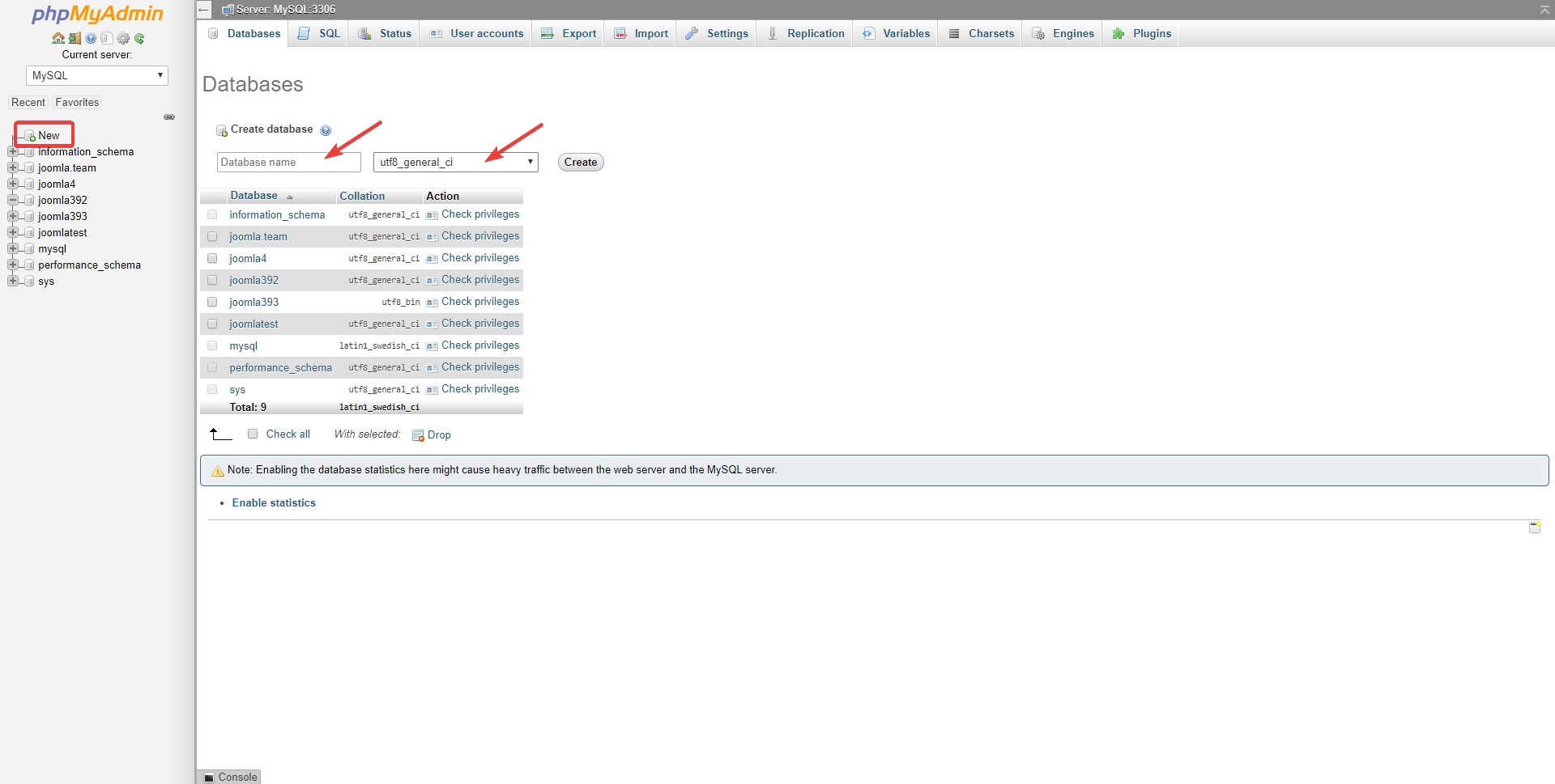 • Klicken Sie auf Neu, geben Sie Ihren Datenbanknamen ein und wählen Sie im Dropdown-Menü utf8_general_ci aus
