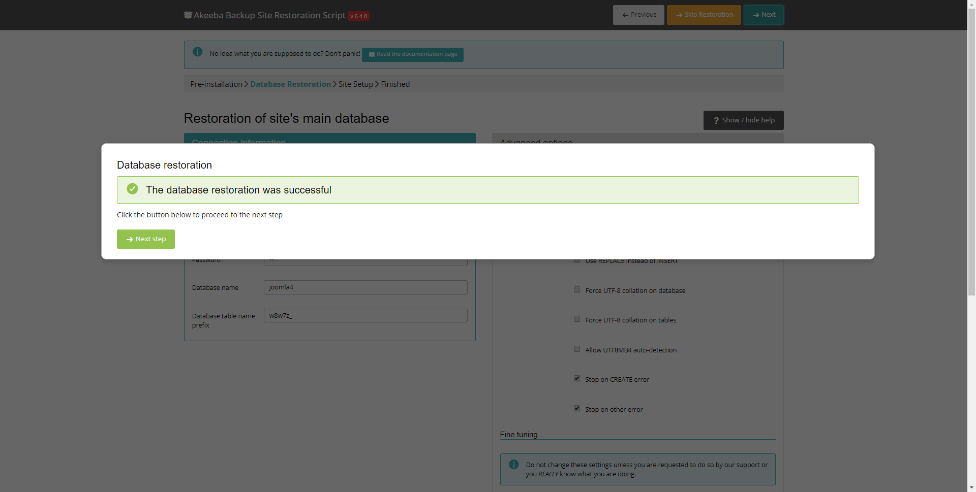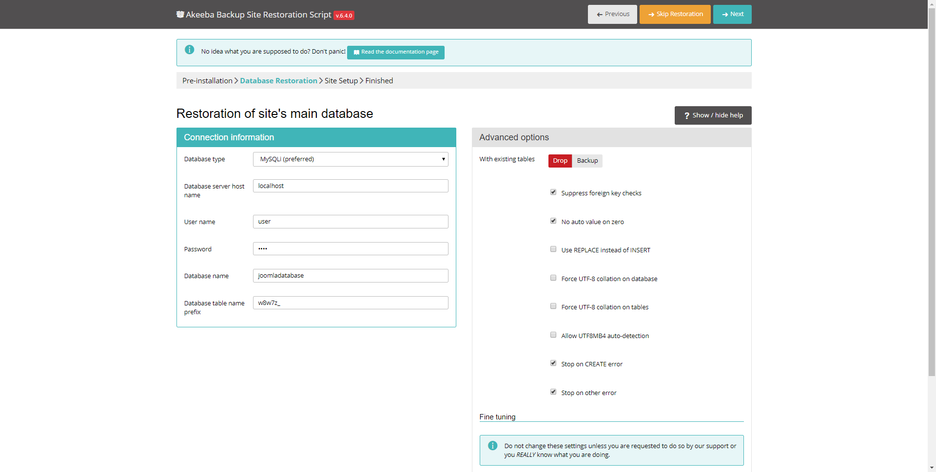 2. Im nächsten Fenster müssen Sie Ihre Anmeldedaten für die Datenbank eingeben. Wenn eine bestehende Joomla-Installation erkannt wird, können diese Felder bereits ausgefüllt sein - andernfalls müssen Sie die folgenden Angaben machen: