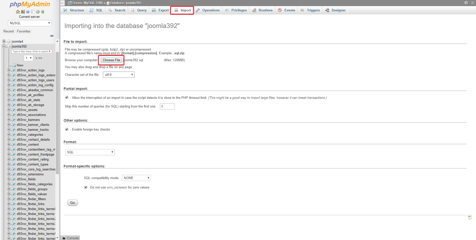 • Klicken Sie auf Import, wählen Sie das SQL-Backup auf Ihrem lokalen Computer aus und klicken Sie auf Go