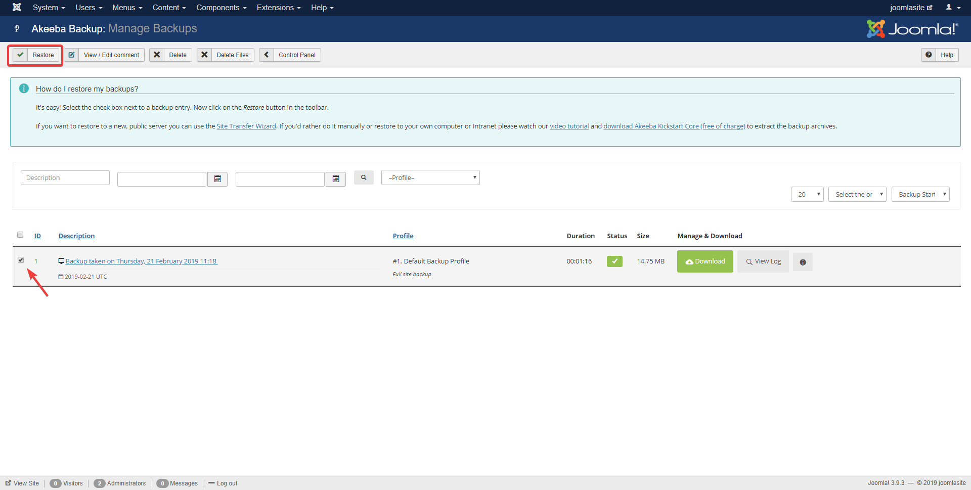Der Ausgangspunkt für die Wiederherstellung einer Webseite ist ein Backup: Wenn Sie noch nicht wissen, wie Sie ein solches erstellen, sehen Sie sich hier unseren Artikel dazu an, wie Sie Ihre Joomla-Seite durch ein Backup sichern können.