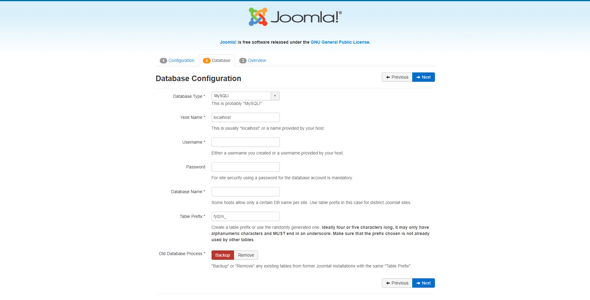 - Datenbanktyp: Dieser Wert ist auf MySQLi voreingestellt - es ist nicht notwendig, das zu ändern