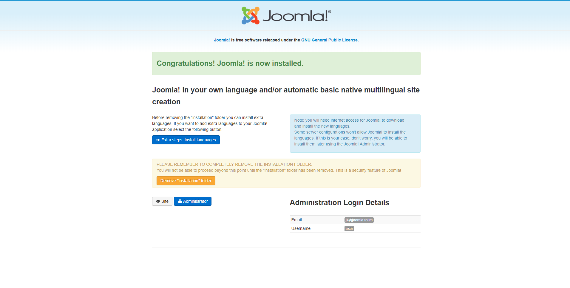 Als letzten Schritt klicken Sie auf die Schaltfläche Remove “installation” folder, und nach ein paar Sekunden sollten Sie beginnen können. Auf der letzten Seite sehen Sie URL-Links, um das Backend und Frontend Ihrer neuen Joomla-Seite zu unterstützen.