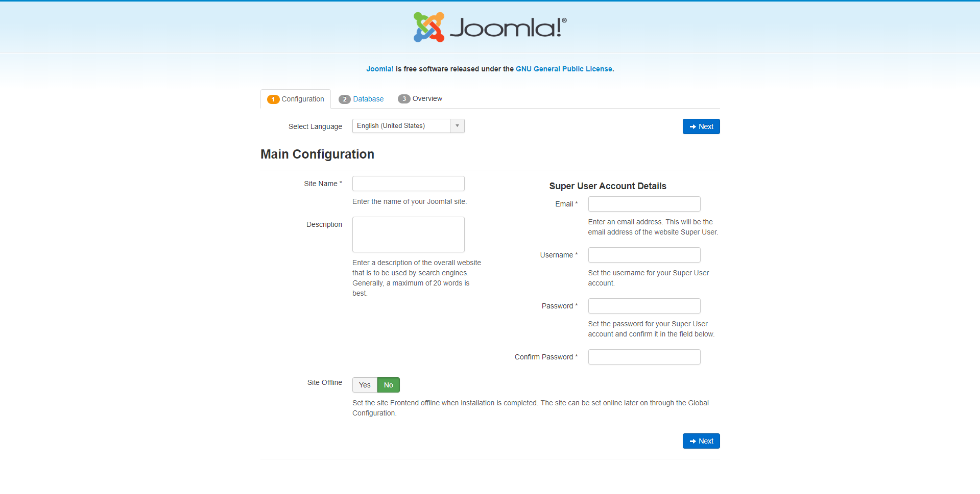 - Seite offline: Wählen Sie "Ja", wenn Sie möchten, dass Ihre Webseite nach der Installation zunächst offline ist. In diesem Fall wird das Frontend Ihrer Webseite einfach "Ihre Webseite ist offline" anzeigen, wenn Sie sie öffnen.